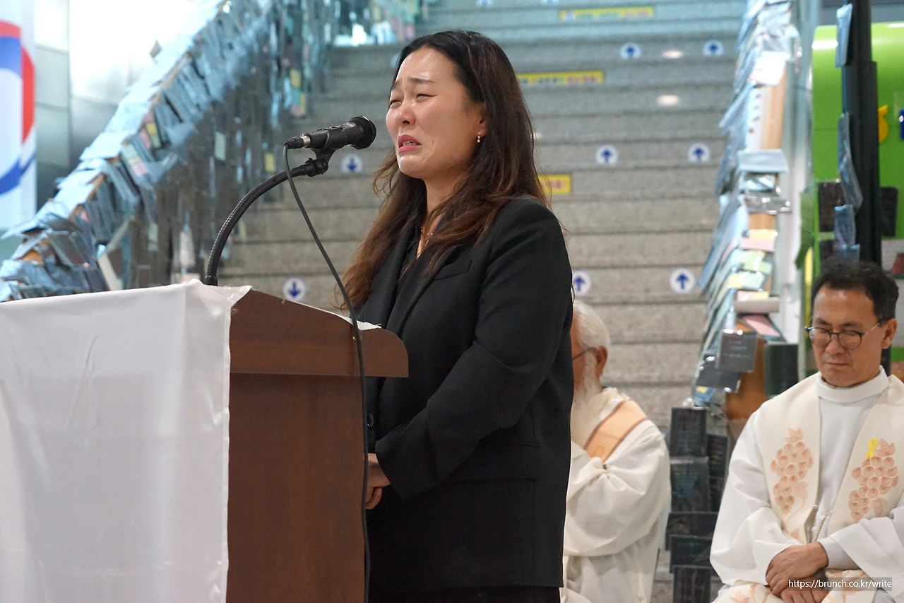 미사 중에 유독 하염없이 눈물을 흘리는 여인이 있었다. 문정현 신부님이 그분에게 다가오시더니 손을 뻗어 달래셨다. 엄숙한 미사 중에 이동하는 신부님의 모습에서 신약 성경에 나오는 가슴 아픈 인물들에게 먼저 다가가는 예수님이 연상됐다. 그 여인은 12.29 무안공항 제주항공 참사 유가족협의회 2기 김유진 대표였다. 그분이 눈물로 발언했다.
