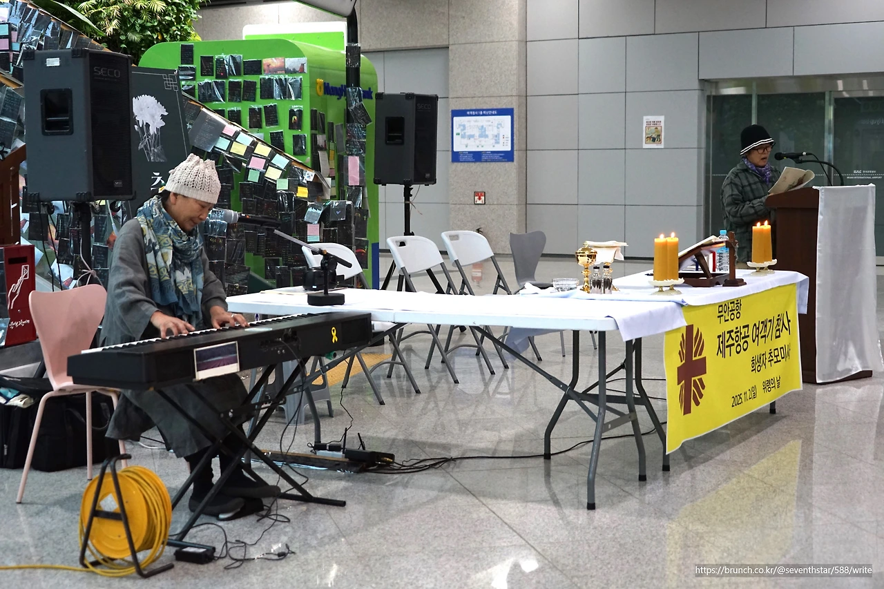 아직 1주기도 되지 않은 유족이 어떻게 힘을 낼 수 있을까. 무너진 마음을 어떻게 굳게 가질 수 있을까. 그리되기를 강복(降福)하는 신부님들의 마지막 기도 후 해남의 나무는 공선옥 작가 시 낭송에 맞춰 키보드를 연주했다. 이어 노래도 했다. 지난겨울, 동안거(冬安居) 중 무안공항 참사 소식을 듣고 마음이 완전히 무너졌다는 나무. 이제야 그 애가(哀歌)를 부르기 시작했다.