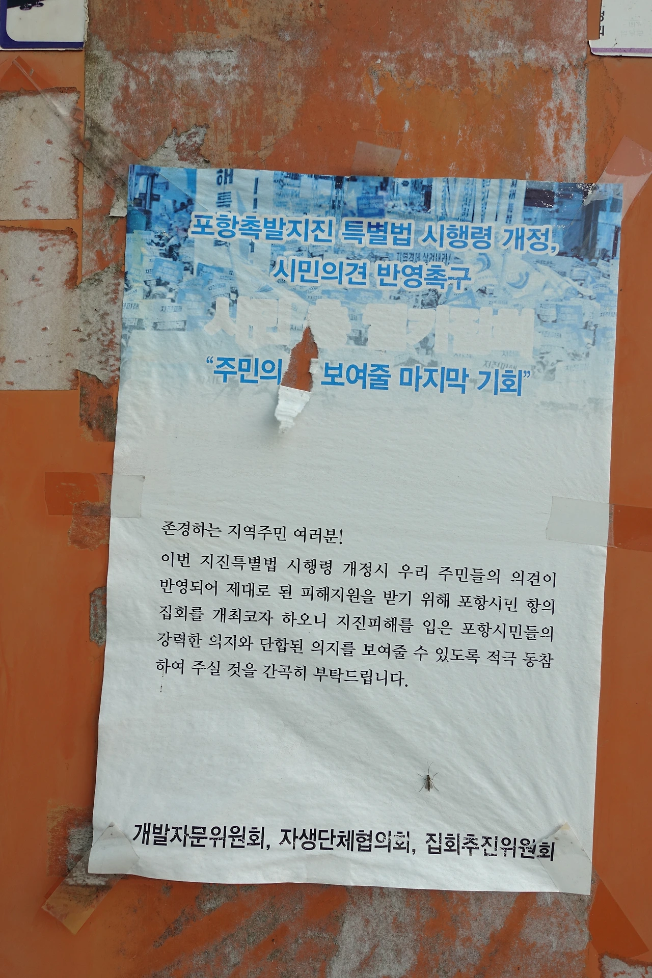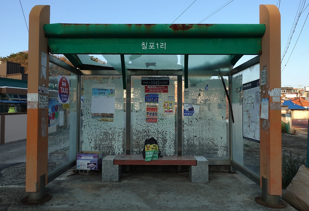 두 시간여 8km를 걸어 마침내 칠포항에 다다랐다. 조금만 더 가면 칠포해수욕장이었는데 벌써 그늘 진 모래밭 800m를 더 걸을 기운이 없었다. 다시 500m를 되돌아와 칠포 1리 정류장에 앉았다. 평소의 나라면 무슨 일이 있어도 목적지까지 갔을 것이다. 그러나 이젠 그게 무슨 소용인가 싶었다. 숭숭 구멍 난 플라스틱 지붕에 뻥 뚫린 정류장이 춥고 배고픈 내 신세 같았다. 기둥에 붙은 낡은 공고문은 포항이 지진지역이었음을 기억나게 했다. 그 아래로 월성과 고리에 핵발전소 10기가 가동 중 1기가 정비 중 2기가 건설 중이었다.