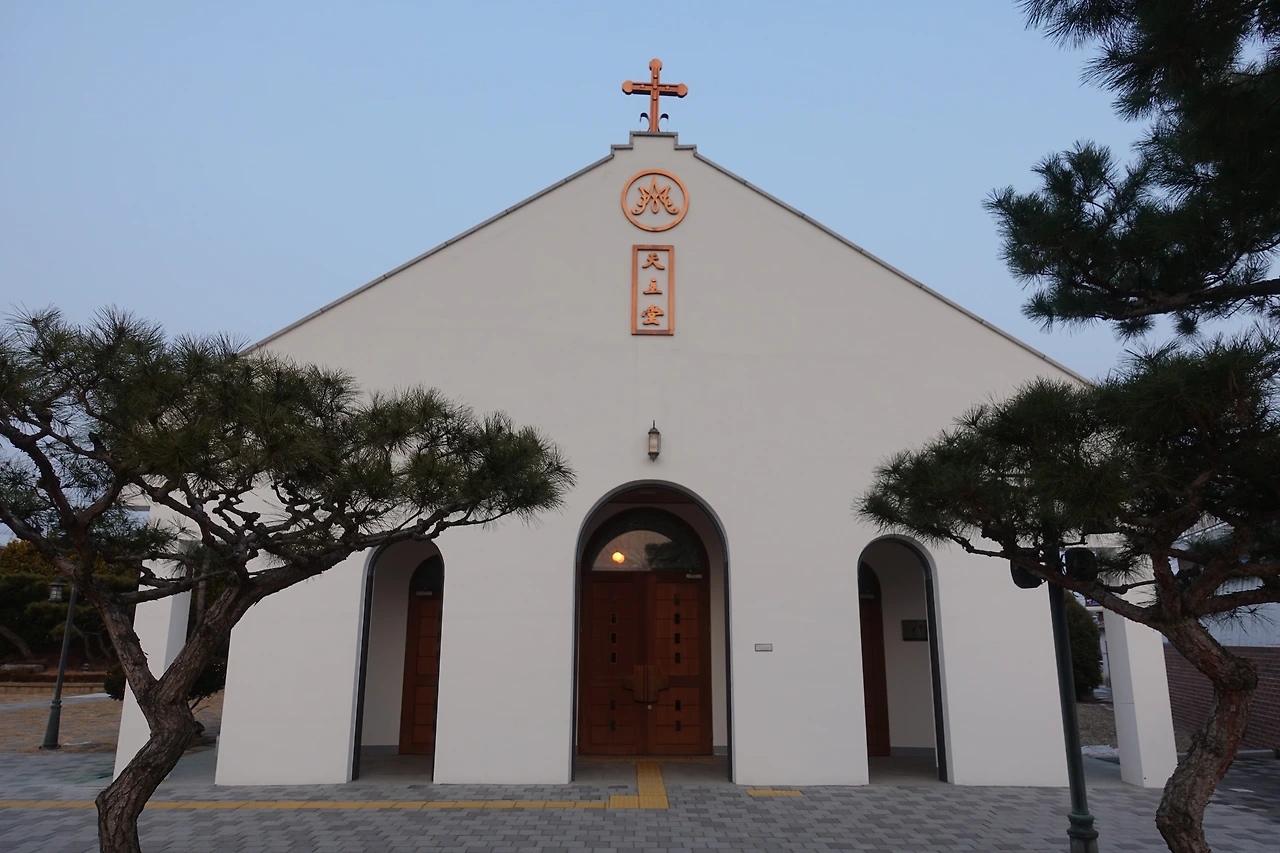 아이보리색 건물에 적벽돌색 높고 뾰족한 지붕의 강경성당보다 곡선인듯한 직선의 지붕 선과 아치형 문이 어우러진 간결하고도 독특한 양식의 건축물이 먼저 눈에 띄었다. 김대건 기념관이었다.
