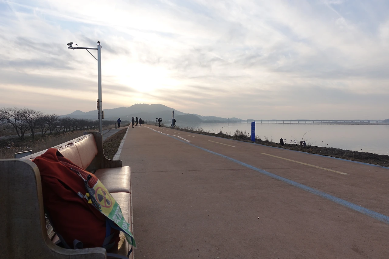 17.5km 걸어오던 종일 보이지 않던 사람들이 한꺼번에 모여있었다. 일몰 시각에 맞춰 철새 촬영을 위해 수십 명이 모여든 것이었다. 강 위에서 고요히 웅크리고 있던 새떼는 사람들의 소음에 신경이 곤두서 있을 게 뻔했다. 게다가 잠시 후 있을 셔터 소리라면? 아마 새들에겐 엄청난 굉음일 것이다.
