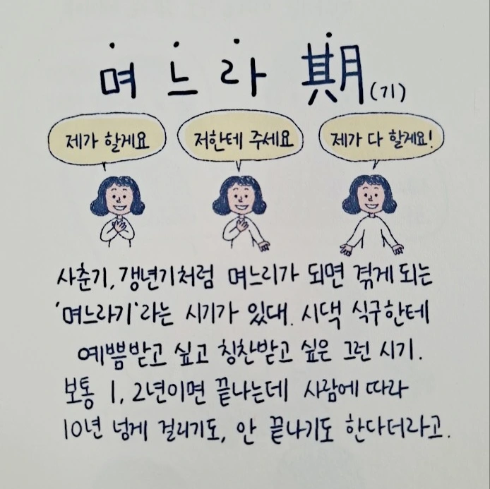 '며느라기'에 속해 있는 이상 나와 같은 상황이라면 누구라도 불편할 것이다. 아무리 멀쩡한 여자를 앉혀놔도, 잘나고 돈 잘 벌고 학벌이 높으신 박사님이라고 해도 말이다. 이것을 깨닫기까지 참으로 오랜 시간이 걸렸다.