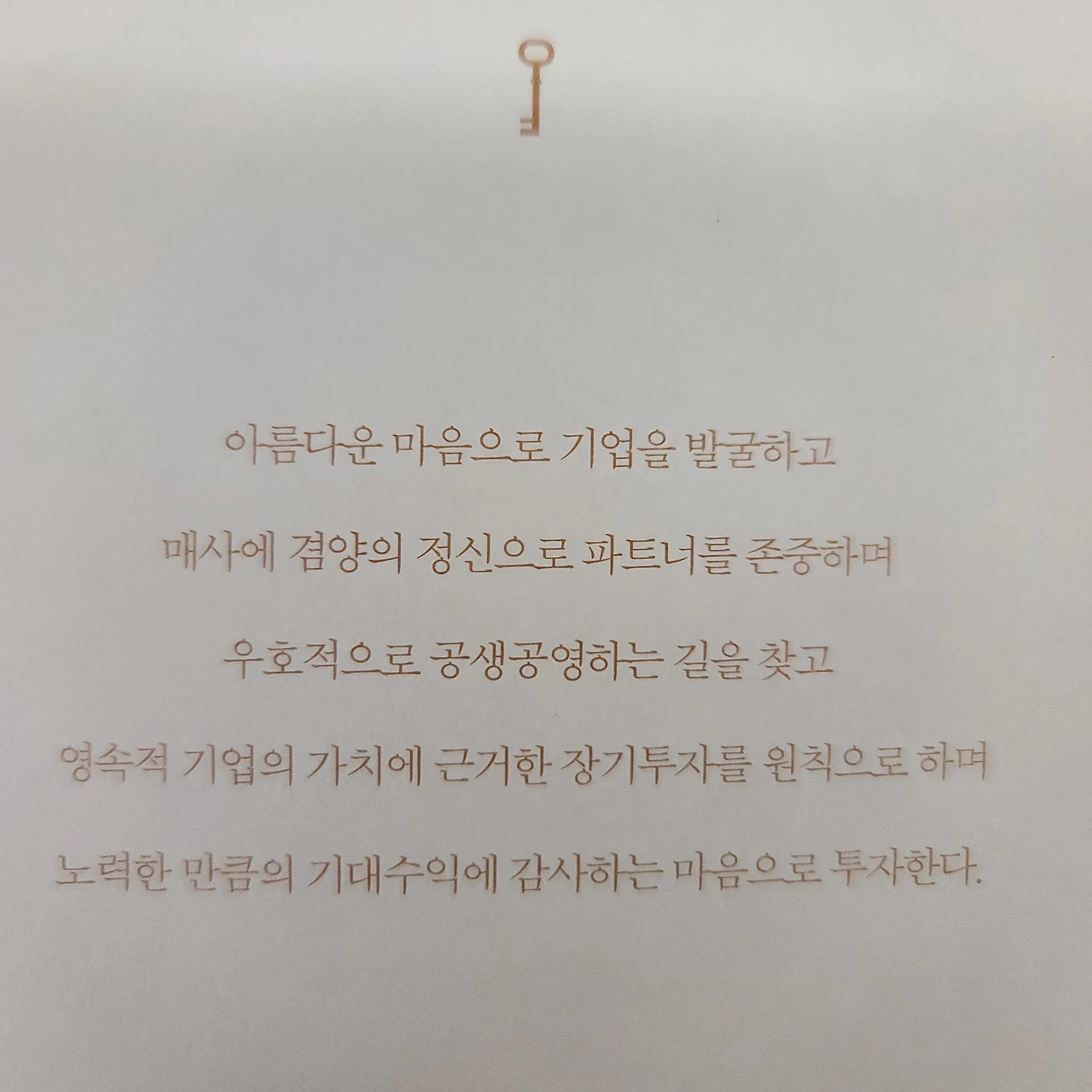 이러한 투자 원칙 하에 성장성 있는 분야에서 경쟁력을 갖춘 기업과 좋은 사업 모델을 가진 기업, 재무구조와 지배구조가 건강한 기업, 열린 경영을 실천하여 소통이 활발한 기업, 그리고 사회적 책임을 다 하는 기업에 투자할 것을 권유하고 있다.