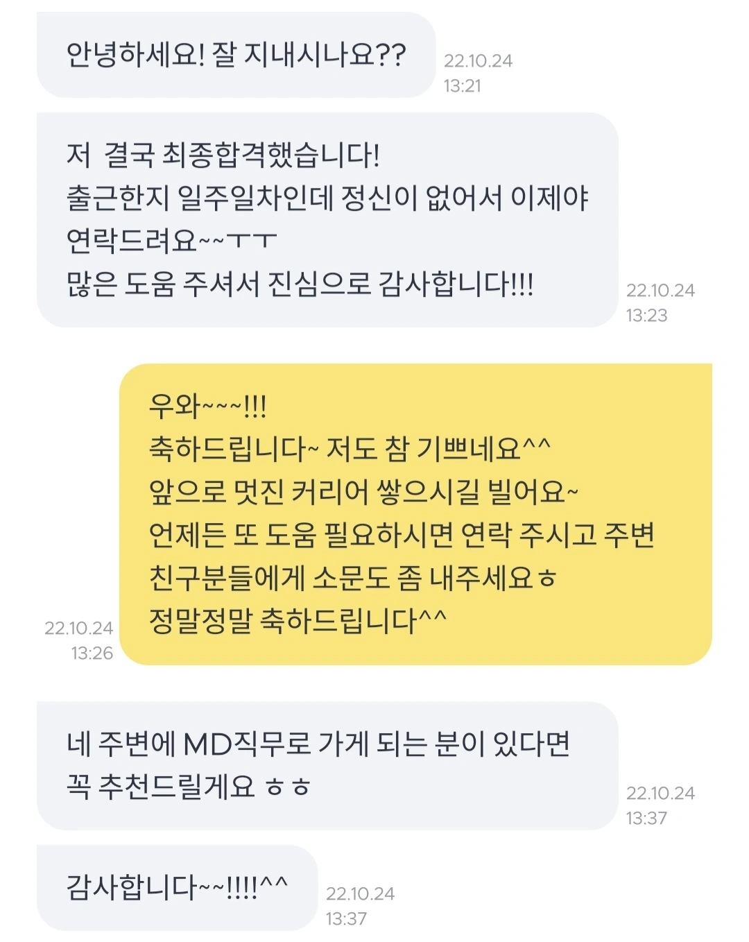 나도 최종 결과가 어떻게 됐을지 궁금했지만 먼저 물어보기도 좀 그래서 연락해보려다 말았는데 이렇게 기쁜 소식을 전해오니 내 일처럼 기뻤다.