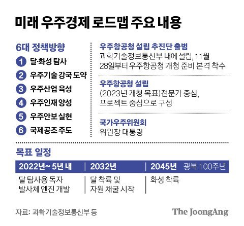 5년 내에 우주개발 예산을 2배로 늘리고, 관련 산업 투자를 2045년까지 최소 100조 원 이상 끌어낼 방침으로 대전·전남·경남에 우주산업 인프라 3각 클러스터를 구축하고, 전문 인력 양성을 위해 초·중·고·대학·대학원 등에 융합 교육 프로그램과 연구센터도 세운다고 합니다.