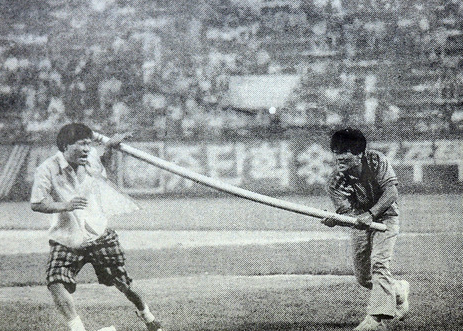 그렇게 표를 구하고 1루 쪽 내야에 자리를 잡고 경기 시작을 기다리고 있자니 주변에 무서운 아저씨들이 많았다. 그때는 그래도 어른 무서워하던 때라 험악한 아저씨들이 내뱉는 온갖 험한 말들에 잔뜩 졸아서, 우리는 우리끼리 있을 때와는 달리 상당히 과묵하고 조용조용하게 말하는 교양 있는 소년으로 변신해 있었다.