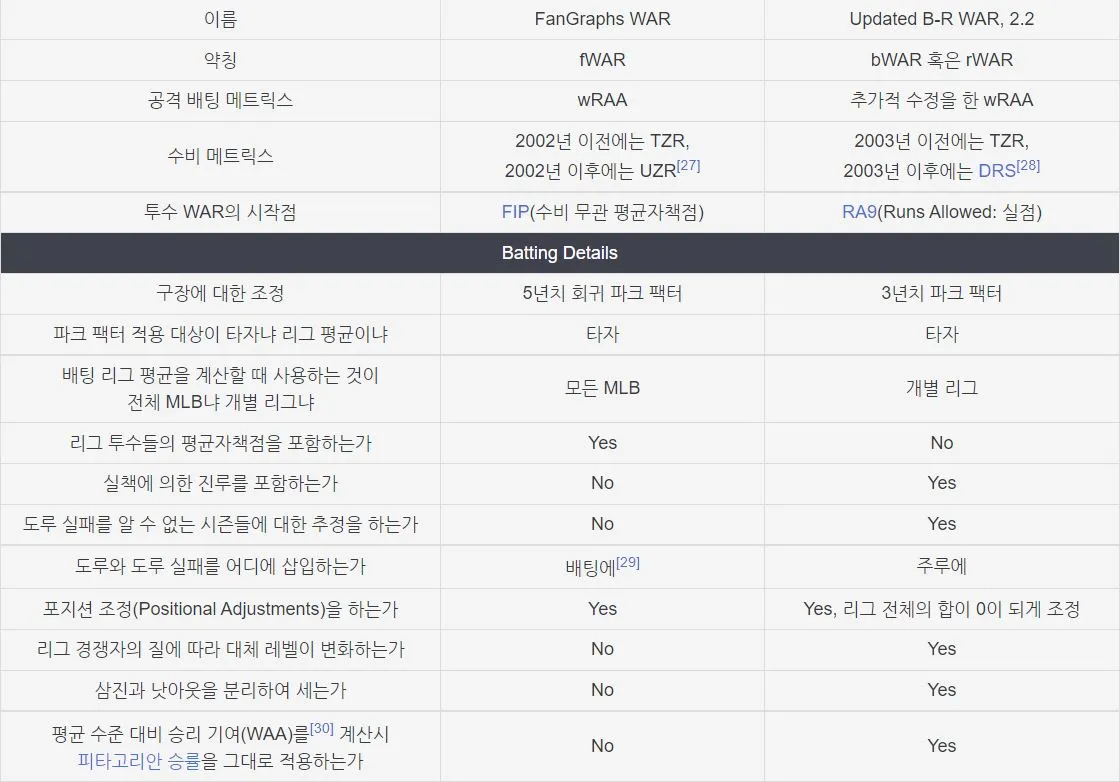 위 표는 fWAR과 bWAR이 각각의 WAR을 구하는 기준을 비교한 표의 일부분입니다.
