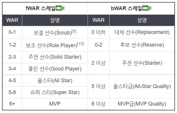 fWAR과 bWAR 선수 레벨 (출처:나무위키)