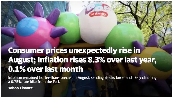 미국 CPI 추이 (5월~9월) 8월에 발표된 7월 CPI는 8.5%였고, 오늘 발표된 8월 CPI는 8.3%이다.