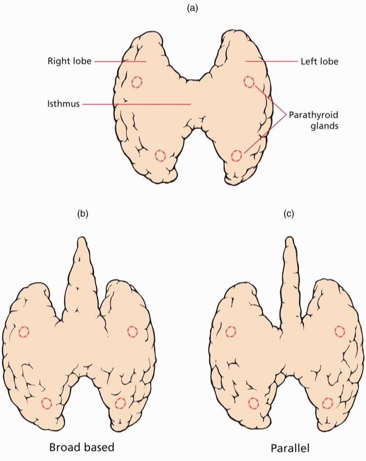 왼쪽 그림 (a)처럼 갑상선은 우엽(right lobe), 좌엽(left lobe), 협부(isthmus)로 구성되어있다. 그리고 일부 사람들은(21% ①) 그림 (b), (c)처럼 협부 위로 피라미드엽(pyramidal lobe)이 꼬리처럼 존재한다.
