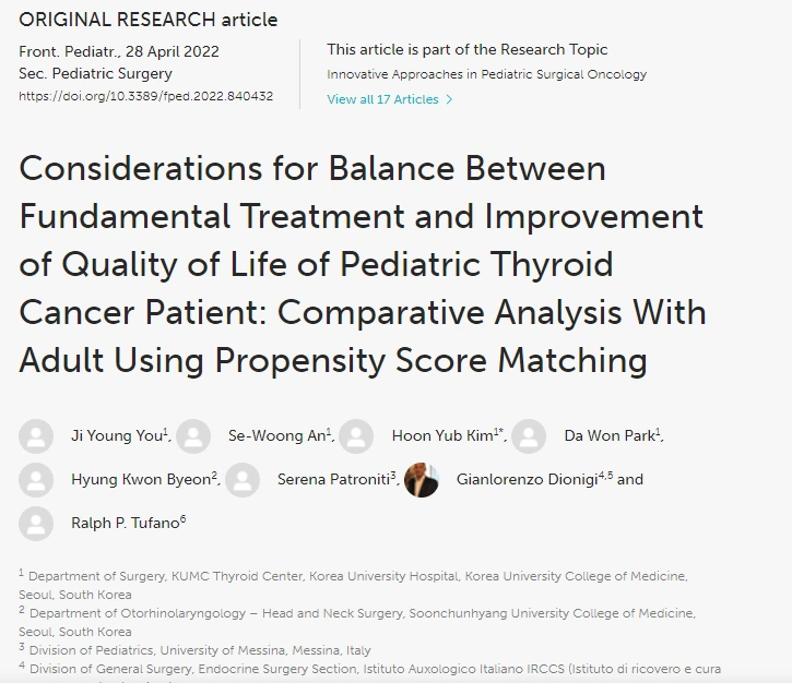 올해 4월 Frontiers in pediatrics 저널에 내가 두번째 저자로 올라간 논문이 실렸다. 제목을 한글로 하면 "소아 갑상선 암 환자의 근본적 치료와 삶의 질 향상의 균형을 위한 고려 사항 : 성향점수매칭을 이용한 성인 사례와 비교"이다. 이 논문은 해당 저널의 Innovative Approaches in Pediatric Surgical Oncology 시리즈 중의 한 논문으로 게재됐다.