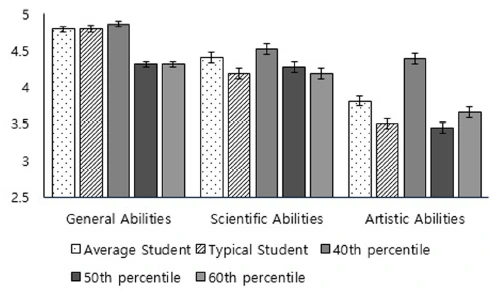 예술적 능력에서 평균 학생, 전형적 학생, 40, 50, 60 백분위수 학생과의 비교는 서로 큰 차이가 없었다.