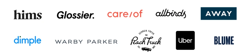Hims, Glossier, Care/of, Allbirds, Away, Dimple, Warby Parker, The peach truck, Blume 와 같이