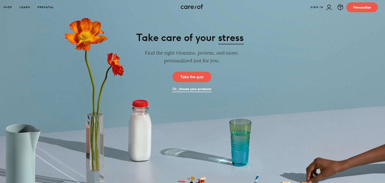 미국의 온라인 헬스케어 브랜드 Care/of는 개인의 건강 상태에 따라 꼭 필요한 영양만을 설계한다는 솔루션을 Subscription 방식을 통해 제공합니다. 고가에 약을 사야 하고 다 먹어야 한다는 매일의 부담감을 해결해 주었죠. 헬스케어도 즐겁고 쉽게 부담 없이 할 수 있다는 인식의 변화를 가져다준 브랜드입니다.