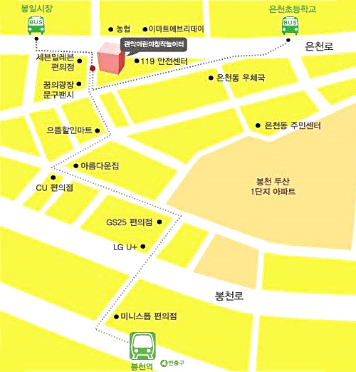 봉천동은 내가 어릴 적 외할머니댁이 있던 동네라 기억 한 구석의 아련한 향수까지 느껴졌다. 밀려오는 여운을 잠시 미뤄두고 서울 은천동 우체국과 119 안전센터 사이의 골목을 거닐다 보니 어느 새 관악어린이창작놀이터에 도착했다.