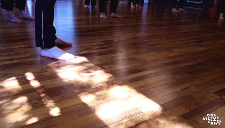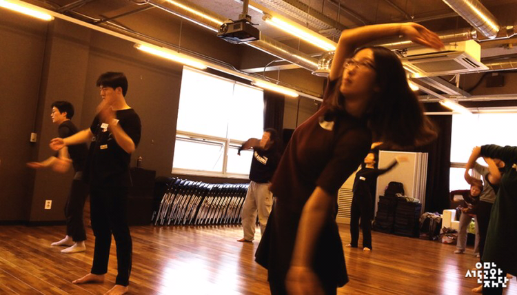 첫 움직임 후 잠깐의 쉬는 시간에 연극 경력 5년차 배우 이가연 씨는 “동작 자체를 배우는 것이 아니라 움직임의 성격과 원리를 다시 보게 되는 것 같아 좋아요. '밀당' 의 원리를 몸으로 이해해보는 시간이었어요.”라고 말했다.