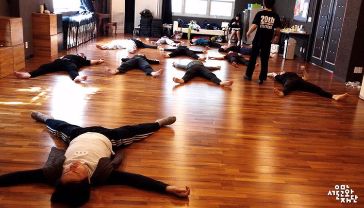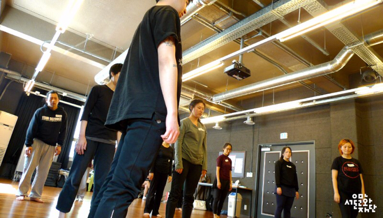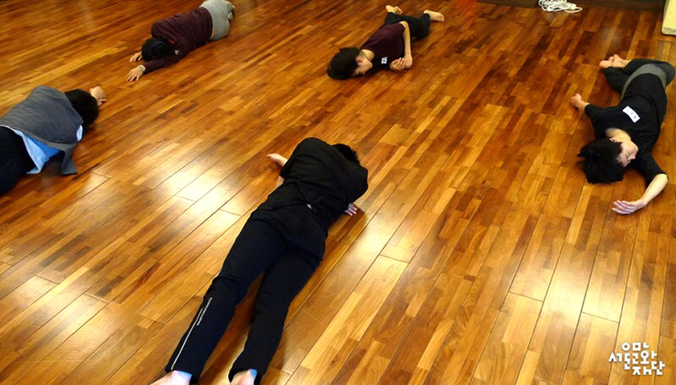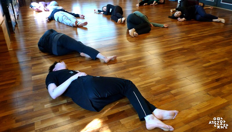 일어섬과 무너짐의 움직임은 몸의 중심을 말고 펴는 동작으로 표현되어졌다. “바닥에 껌딱지처럼 ‘철썩’ 붙어라.”는 말과 함께 고재경 마임이스트는 마치 자신의 몸이 아닌 듯 먼저 시범을 보였고, 강사의 주문인 ‘철썩’이라는 단어에서 오는 움직임의 느낌을 따라 배우들 역시 움직였다. 이와 같은 동작을 바닥이 나를 끌어당기듯이, 바닥으로부터 멀어지려는 듯이 표현해보고 팔과 다리를 누군가 끌어당기듯이, 혹은 내부의 어떤 광선이 밀어내듯이 움직여보며 밀고 당기는 방향성에 따라 같은 동작이 어떻게 다르게 표현되는지를 경험하는 시간이었다.