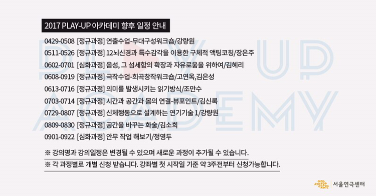 연극인 재교육 프로그램으로 시작된 <PLAY UP 아카데미>는 올해 연출 분야를 넘어 극단에 실질적 액팅 코칭까지 포함하여 영역을 확대할 예정이다. 앞으로 다양한 주제 안에서 참여하게 될 연극인들에게 교육뿐 아니라 새로운 도전이 될 수 있는 재창조의 시간이 될 것이다.