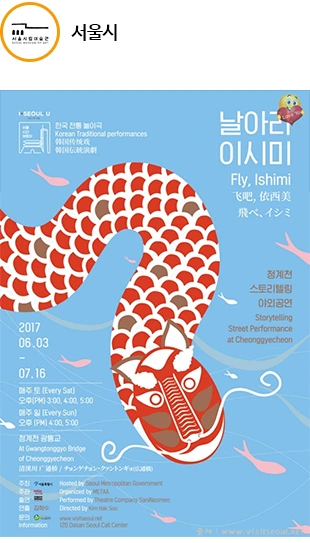 전통인형극 ‘꼭두각지놀음’ 중 한 대목인 ‘이시미 거리’를 재조명한 야외 공연. 청계천의 환경문제를 이야기로 풀어낸 이번 전통인형극은 한국의 대표적인 전통연희 연출가 김학수와 극단 사니너머가 참여해 성난 이시미를 달래는 마을축제를 재현한다.