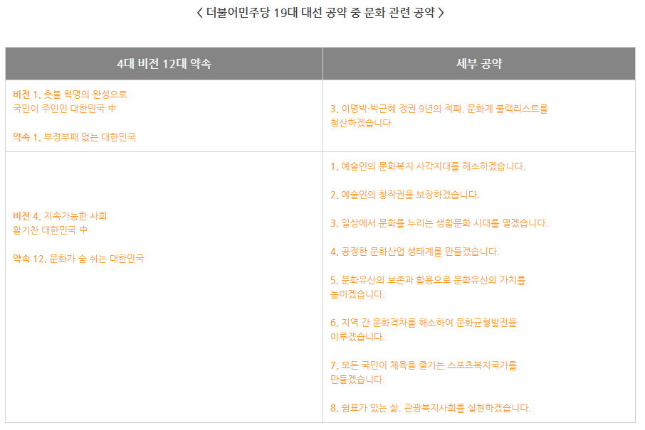 19대 대선에서 더불어민주당의 문화 관련 공약은 ‘이명박·박근혜 정권 9년의 적폐, 문화계 블랙리스트 청산’과 함께 12번째 약속 ‘문화가 숨 쉬는 대한민국’분야의 8대 과제로 요약된다.