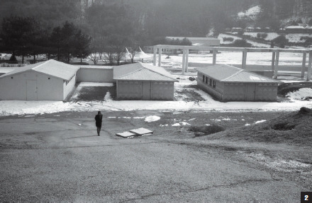 형 박찬욱 감독이 <JSA>를 만든 2000년, 동생 박찬경 작가는 <JSA> 촬영장을 비롯한 남양주 세트장의 면면을 사진으로 담았고, 자막을 더해 서울시립미술관에서 슬라이드 영상 를 선보였다. 두 사람이 파킹찬스로 뭉치기 전에도 이미 비슷한 맥락의 작업이 있었다는 사실이 흥미롭다. 박찬경 작가가 말을 잇는다. “그 공간이 지난 17년간의 남북관계와 비슷한 부분이 많았어요. 처음에는 반짝했지만 그 뒤로는 방치되고, 지속적으로 관리되지 않고 버려진 느낌이요. 이후의 대북 정책과 오늘날의 국제 정세를 보면 더욱 그렇죠. 당장이라도 통일이 될 것 같던 그 뜨거운 열기가 과연 진짜였을까 싶을 만큼 긴장이 심화되었잖아요. 참담한 마음이 들어요. 지난 17년간 어쩌다 이렇게 된 걸까요?” 해결되지 않은 질문을 품은 채, 형제는 일반 촬영보다 2배 이상 힘이 드는 3D 영상으로 남양주의 세트장을 새로 담았다. 기존의 영화에서 선별한 장면과 새로 찍은 장면이 절묘하게 결합되어 완성된 <격세지감>은 한 편의 시처럼 여운을 남긴다. 초현실주의 화가의 그림처럼 초월적인 세계를 펼쳐 보인다.