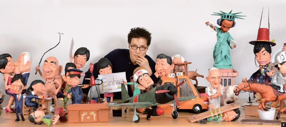 그동안 300여 개나 만들었건만 아직도 어렵다. 늘 시간이 부족하다. 작업 시간을 단축하려고 여러 재료를 써봤는데, 한지만큼 좋은 재료는 없는 것 같다. 정치판을 표현하는 데 있어 한지의 거친 질감과 색감은 안성맞춤이다. 철사로 뼈대를 만들고 권력자들의 비리와 갑질 소식이 넘쳐나는 신문지를 뭉쳐 종이테이프로 살을 붙이고, 색한지를 풀로 붙여 완성한다.