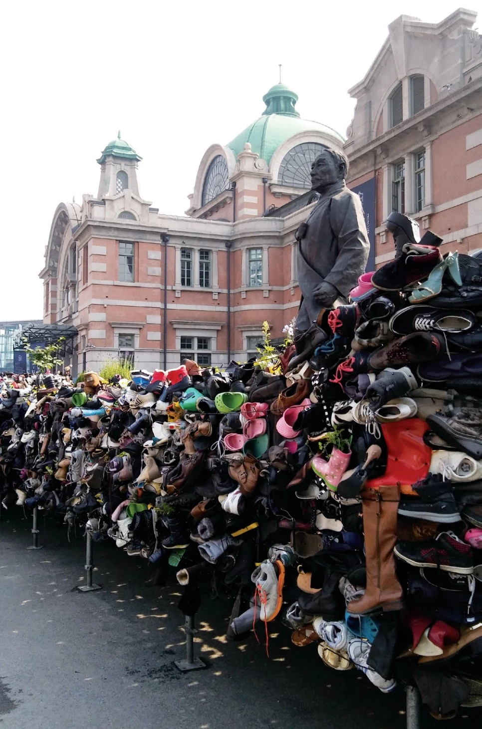요약하면 황지해 작가는 폐기처분될 고가도로의 운명에서 새로 태어난 서울로7017의 모습에서 착안해 재활용함에 버려진 신발을 택했다는 것이다. 서울로7017은 서울시의 영역이고, 서울역 광장은 철도청, 나라의 땅이다. 그래도 가든 디자이너인 작가가 스스로 말했듯이 “누가 봐도 예쁘지만 진부한 꽃과 나무”를 택했다면 작품은 시민들의 요청에 의해 두 영토를 이으며 좀 더 오래 남았을지도 모른다.