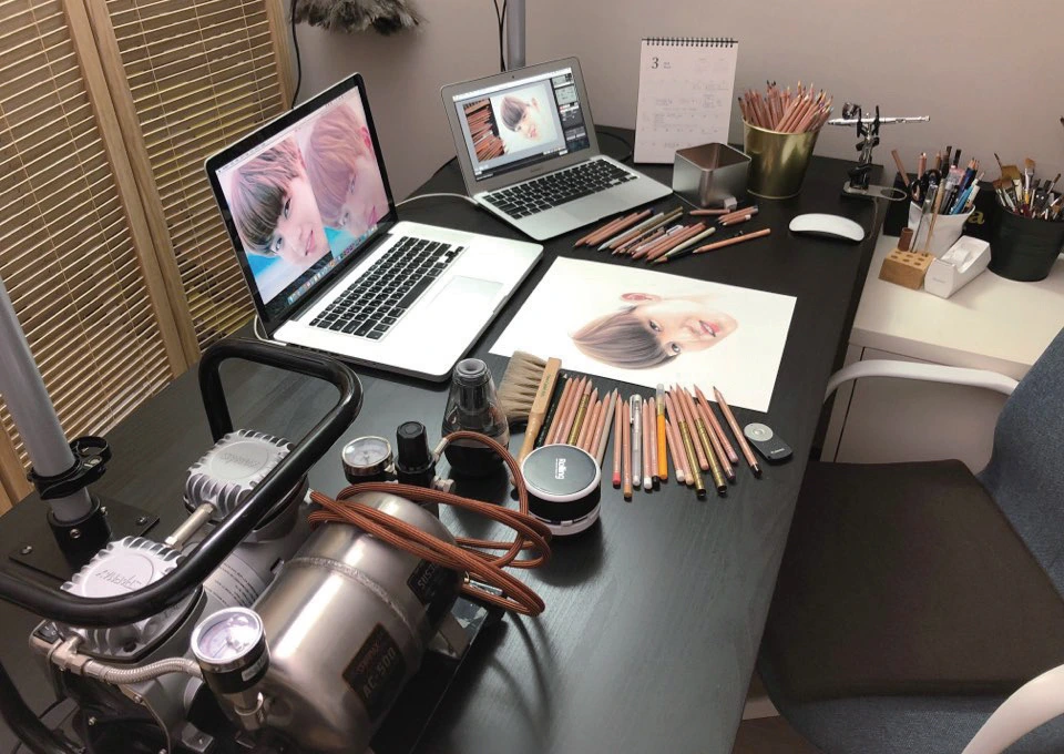 작업할 때는 영상미를 위해 그림의 전체를 생각하며 부분적으로 완성해나간다. 인물이나 사물 등 그림의 대상을 선택할 때는 많이 고민하며 자료를 찾는다. 인물의 특징이 잘 담긴 사진 한 장이 필요하기에 사진을 고르는 데 많은 시간을 투자해야 한다. 인물 위주로 작업하며 개개인의 특징을 살피다 보면 한 명 한 명이 다 특별하게 느껴지고, 그림을 그리는 동안 그 대상에 흠뻑 빠지게 된다.
