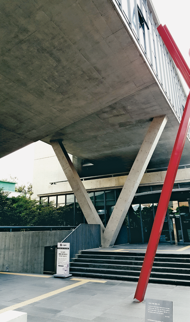 아트센터 외부의 계단을 이용해 올라가면 마당과 마주한다. 마당의 왼편으로는 넓은 외부계단과 함께 ‘V’ 형 기둥이 받치고 있는
