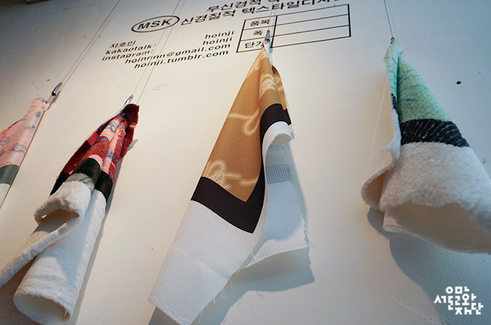 작가는 이번 전시에서 기존의 캔버스에서 잘 다루지 않는 방식으로 천(폴리에스테르 소재)에 오브제를 전사한 판화 타입의 평면 작업과 아트 제품을 선보입니다. 그의 작품들은 물감 대신 털, 실크, 데님 등이 갖고 있는 재질로 독특한 질감을 드러냅니다. 공간 곳곳 아이디어가 색다른 전시 디스플레이도 인상적입니다. 제목과 작품 가격을 적은 캡션이 원단에 붙어있는 라벨처럼 생겼어요. 작가는 동대문 원단 시장에서 사용하는 제품 표시법에서 힌트를 얻었다고 합니다. 전시장 입구의 휘날리는 천은 시장에서 제품 구매자들을 위해 무료로 제공하는 샘플과 같은 의미를 지닙니다.