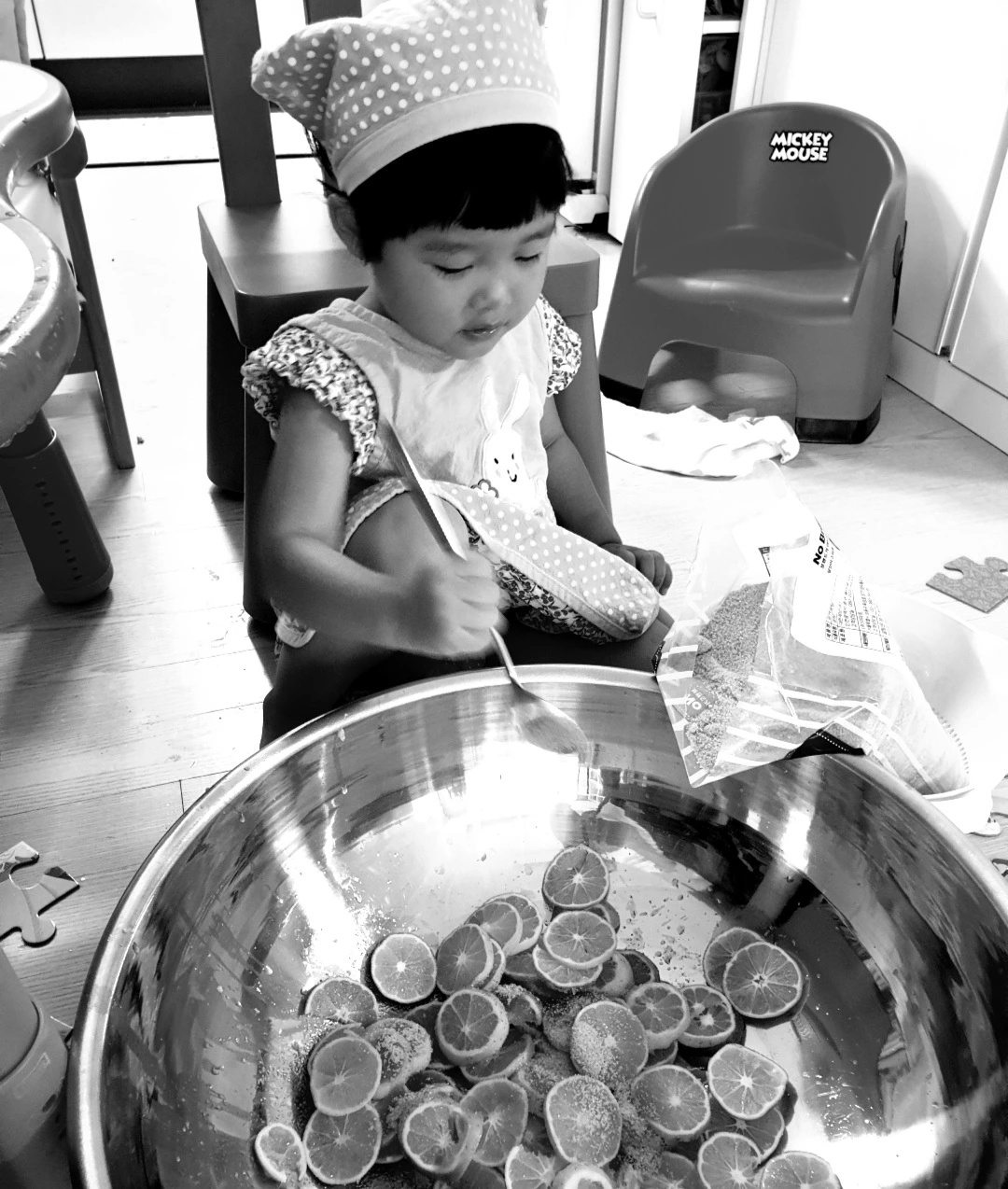 직접 자른 청귤을 설탕에 버무리는 36개월 첫째