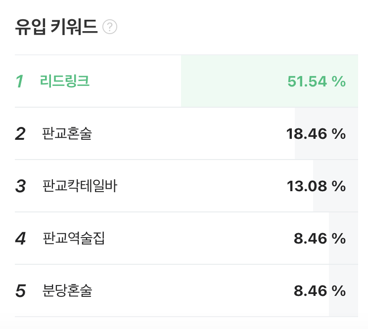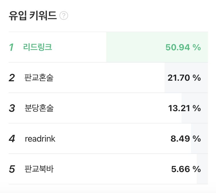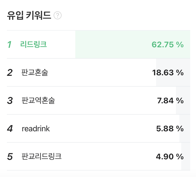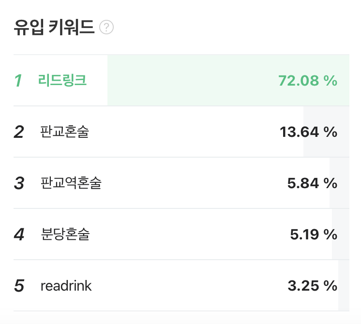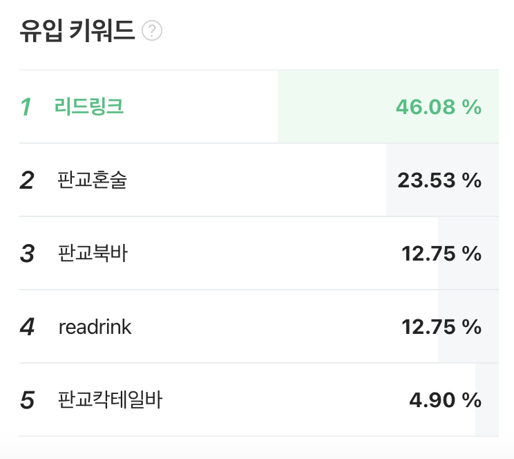 다행히, 누가 봐도 술집/맛집에는 어울리지 않는 것을 학습하는 과정은 네이버와 이용자 모두에게 필요했을 테고, 몇 개월간의 시행착오를 거친 끝에 가장 최근 readrink 유입키워드는 내가 바라던 브랜딩의 결과로 나타났다.