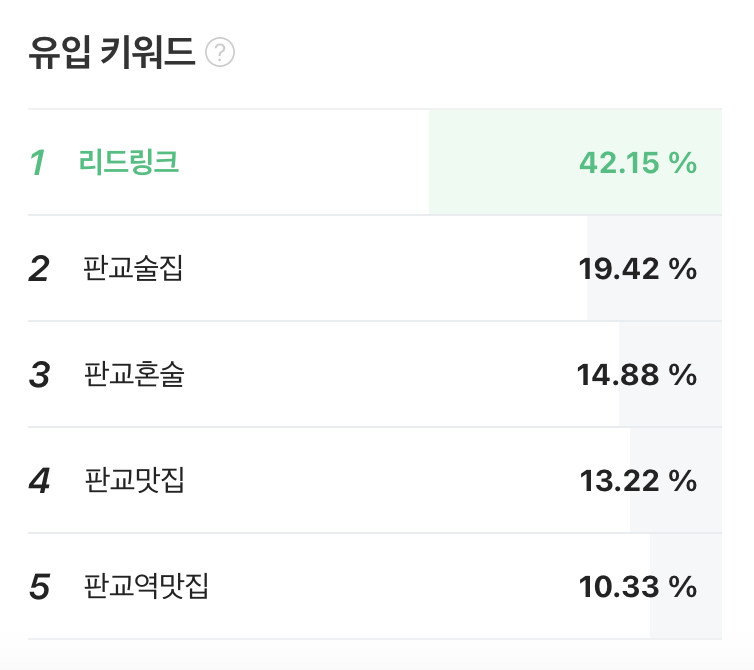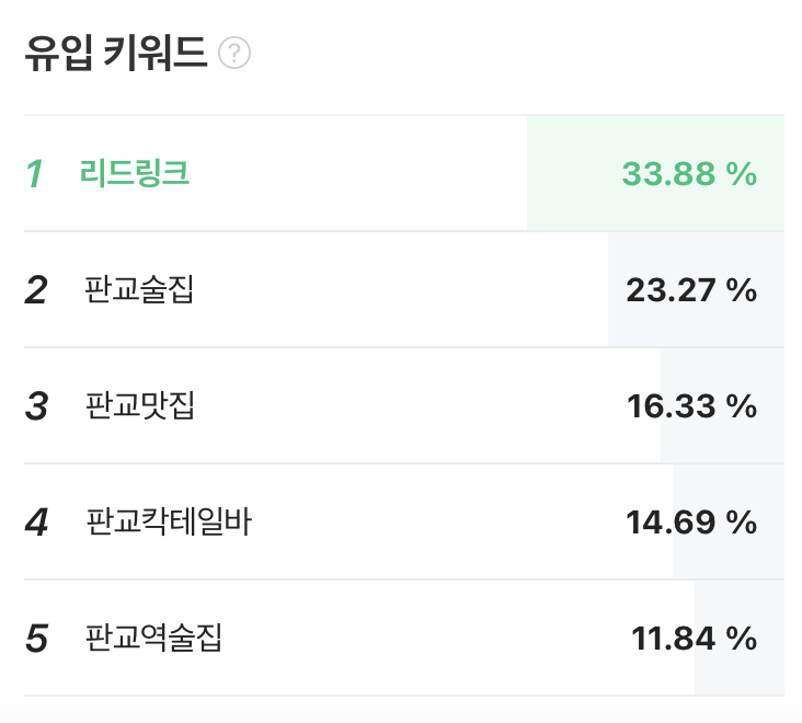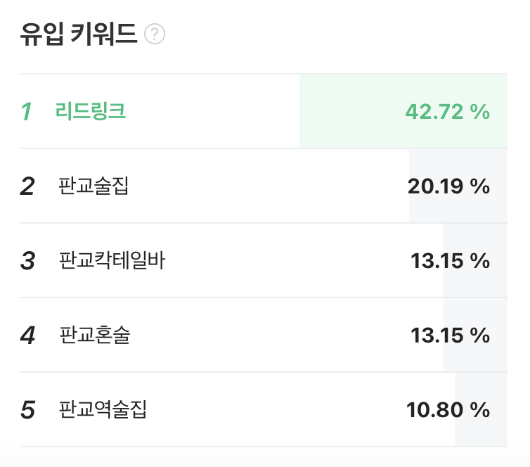 가게 상호를 제외하고 가장 많이 유입된 키워드는 "판교역술집, 판교술집, 판교역맛집, 판교맛집" 등이었다.