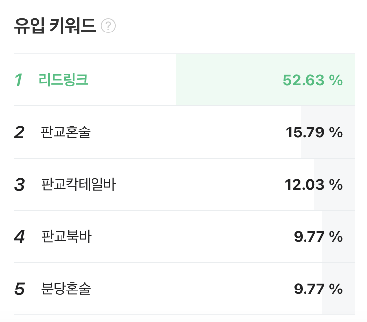 상호를 제외하면, 이번달 유입키워드는 [판교혼술/분당혼술/판교북바]이다.