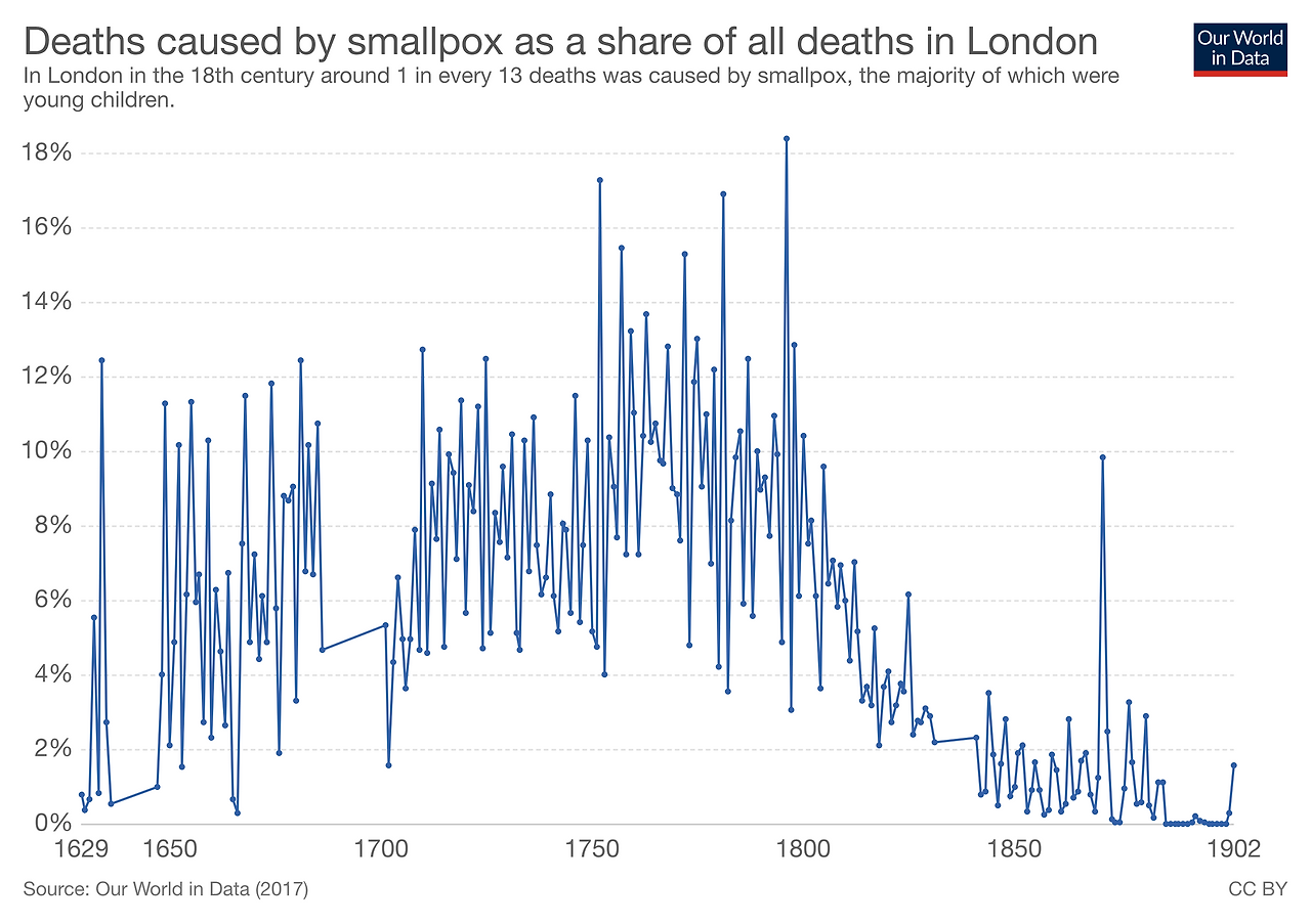 천연두는 감염성 질환으로 바리올라 바이러스(Variola virus)에 의해 야기된다. 질병 감염 시 치사율이 30%에 이르고, 특히 아이들에게는 더 높은 치사율을 보인다. 일부 생존자들은 피부에 상처가 남거나 안타깝게도 실명하기도 한다. 언제부터 천연두가 인류를 괴롭혔는지는 분명하지 않지만 천연두에 대한 흔적은 기원전 10세기 이집트 람세스 5세의 미라에서도 발견된다. 천연두는 16세기 유럽에서 대유행하였고 이는 제국주의 시대 유럽의 시민지 건설 시기와 겹쳐 전 세계로 퍼져나가 전 세계 곳곳에서 당시 가장 큰 사망 요인이 된다. 외부 세계와 단절된 호주 등 일부 작은 섬을 제외하면 18세기 중반까지도 여전히 천연두는 세계 곳곳에서 가장 큰 사망 요인이 된다. 당시 연간 약 사십만 명이 이 질병으로 사망하였다고 보고 된다. 20세기에만도 약 3억 명이 천연두로 사망한 것으로 추정된다. 가깝게는 1967년에도 천오백만 건이 발생한 것으로 추정된다. 가히 당시 인류의 최대 적이라고 할만했다. 이러한 천연두는 에드워드 제너의 발견으로 시작된 효과적인 백신의 개발과 세계 곳곳에서 시행된 정부 차원의 의무적 도입으로 인해 서서히 지구 상에서 사라지게 된다. 이러한 노력의 성과로 1977년 이후 천연두에 감염된 경우가 보고되지 않고 있으며, 1980년 세계 보건 기구 (World Health Organization, WHO)는 천연두가 박멸되었다고 선포하였다. 덕분에 우리들은 천연두에 걸릴 위험으로부터 해방되었고 또한 현재는 천연두에 대한 예방접종도 하지 않고 있다. 천연두가 당시 얼마나 무서운 질환인지를 기억하고 이러한 극적인 변화를 살펴보면 에드워드 제너의 백신 발견이 인류 역사에 얼마나 중요했는지, 왜 에드워드 제너의 백신의 발견을 역사상 그 어떤 인간의 행위보다 많은 삶을 구해냈다고 하는지, 더 나아가 에드워드 제너가 왜 그렇게 무모해 보인 실험을 진행했는지를 조금은 이해하게 해 준다.