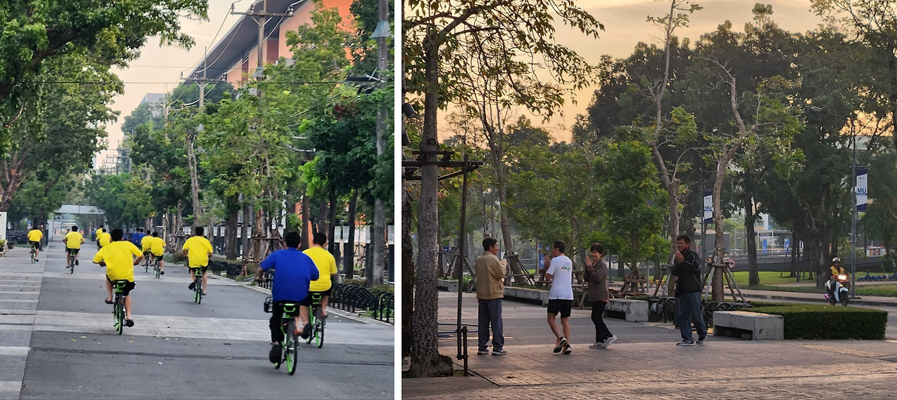동쪽 하늘에서 아침 해가 떠오르자 서쪽 하늘의 달은 희미해진다. 걷는 사람, 달리는 사람, 자전거를 타는 사람들이 점점 많아지기 시작한다. 우리들의 방콕 하루가 시작되고 있다.