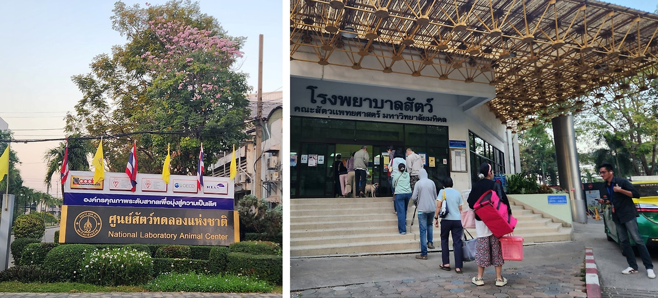 수의과대학 병원 앞에 이르렀다. 병원은 아침 7시에 문을 연다. 그러나 병원 앞에는 벌써 사람들이 개나 고양이를 안고 긴 줄을 서있다. 태국은 아직 많은 사람이 반려견이나 반려묘와 함께하는 문화는 아니다. 오직 이곳에서만 볼 수 있는 모습이다.