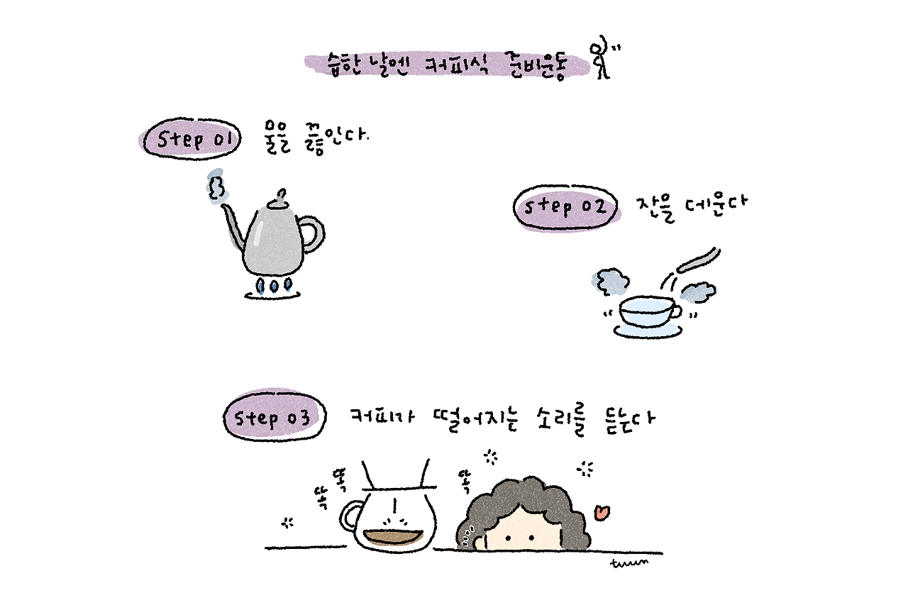 혼자 커피를 내리고 있는 지금은 오롯이 나에게 다정한 시간이다. 뜨거운 물을 흘려보내면 꼭 ‘자 이제 커피가 입장합니다~’하고 커피잔과 나에게 알려주는 것 같다. 이제 조금씩 물을 부어 커피를 내린다. 일부러 똑똑 떨어지는 커피 소리에 귀를 기울여 보기도 한다. 한 방울씩 떨어지던 것이 어느덧 한 잔을 가득 채운다. 그 과정을 하나하나 맛보며 내려진 커피는 조금 더 특별해진다. 축축한 날씨덕에 훨씬 향기롭다.
