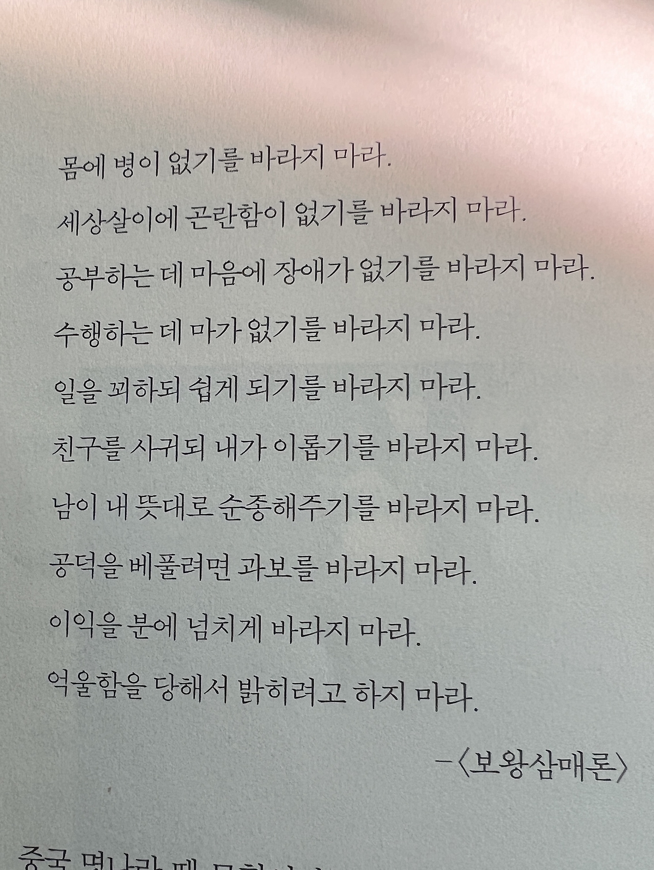 어제 읽었던 박웅현 작가님의 '여덟 단어' 중 인생 부분 중 보왕삼매론이 떠올랐다.