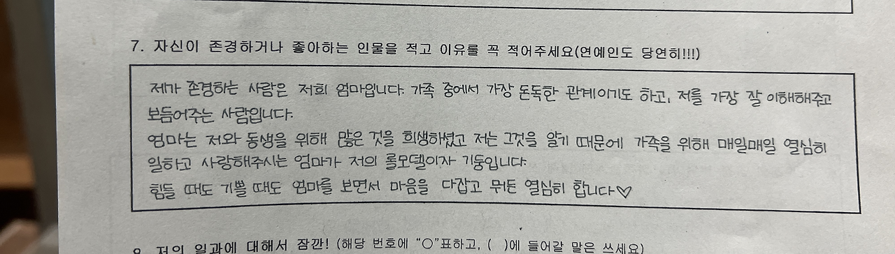 하원하면서 받아온 자기소개서에 큰 아이가 롤모델에 대해서 적는 부분에 나를 적었다.