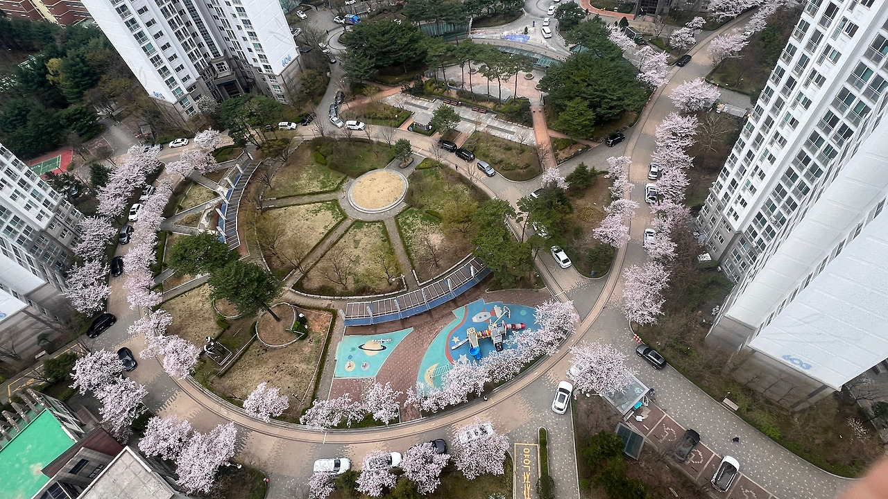 창밖에 보이는 아파트 정원에