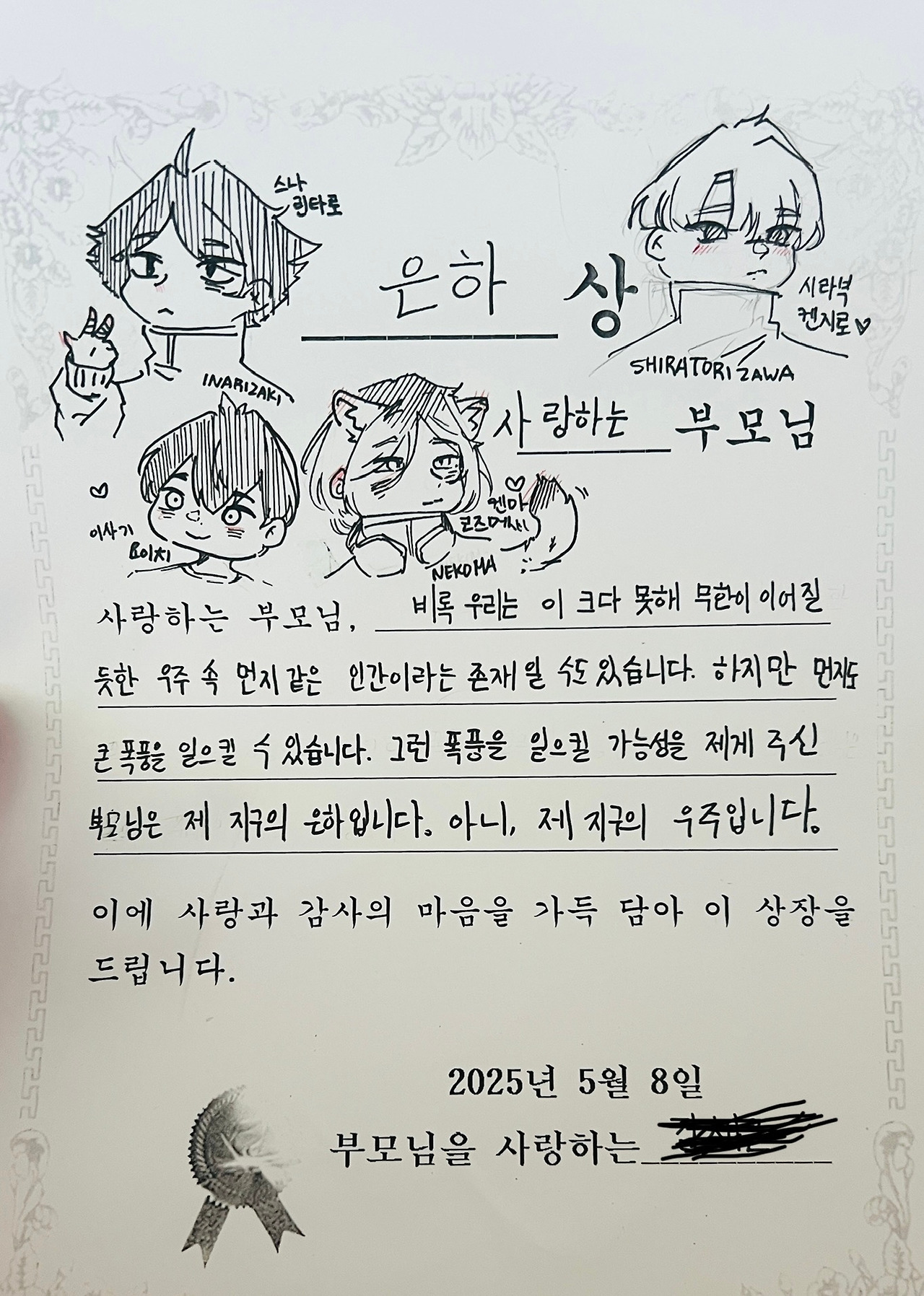 “부모님은 제 지구의 은하입니다. 아니, 제 지구의 우주입니다.”