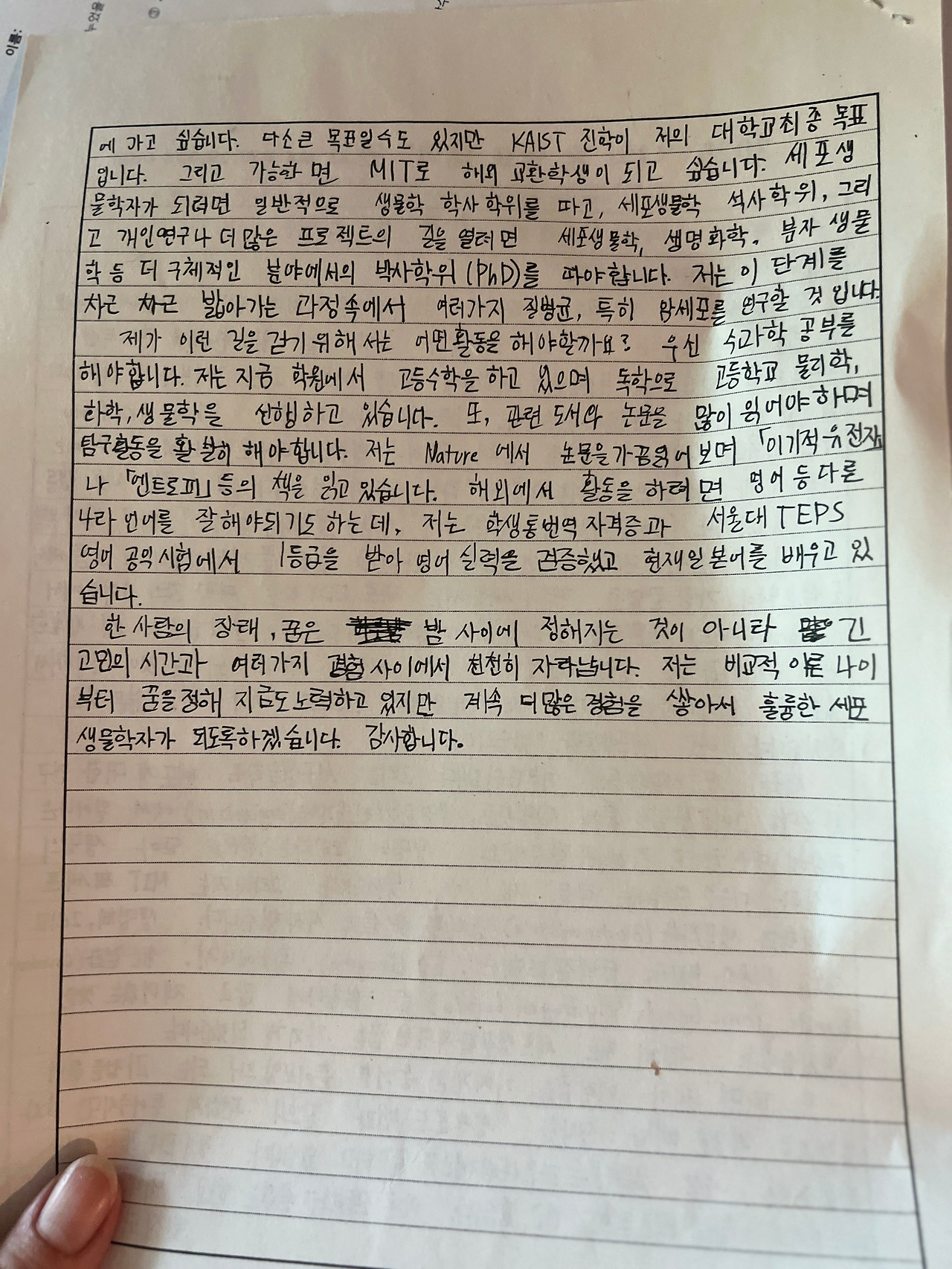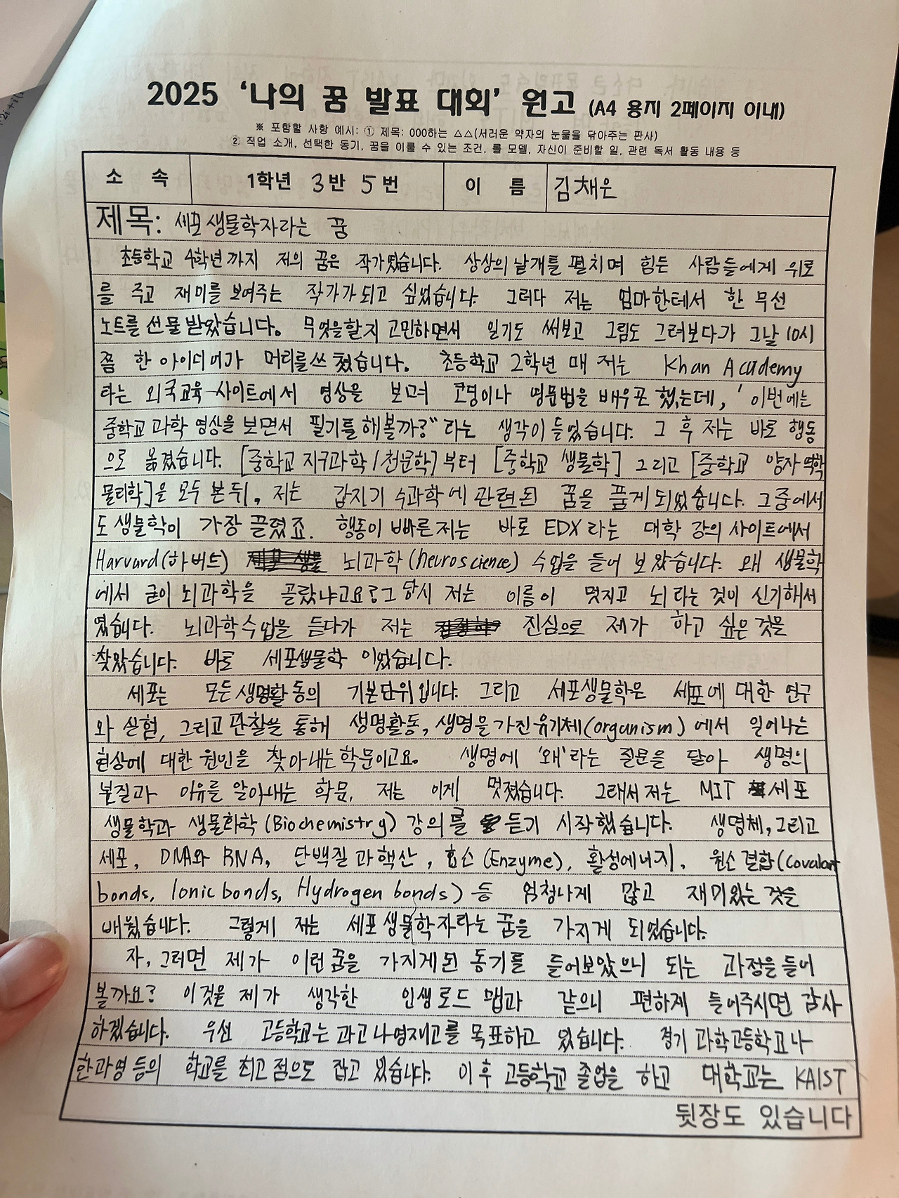 아직 중학교 1학년인 아이가, 세포 속에서 삶의 비밀을 찾고 싶다며 그 꿈을 또박또박 적어 내려간 글이었다.