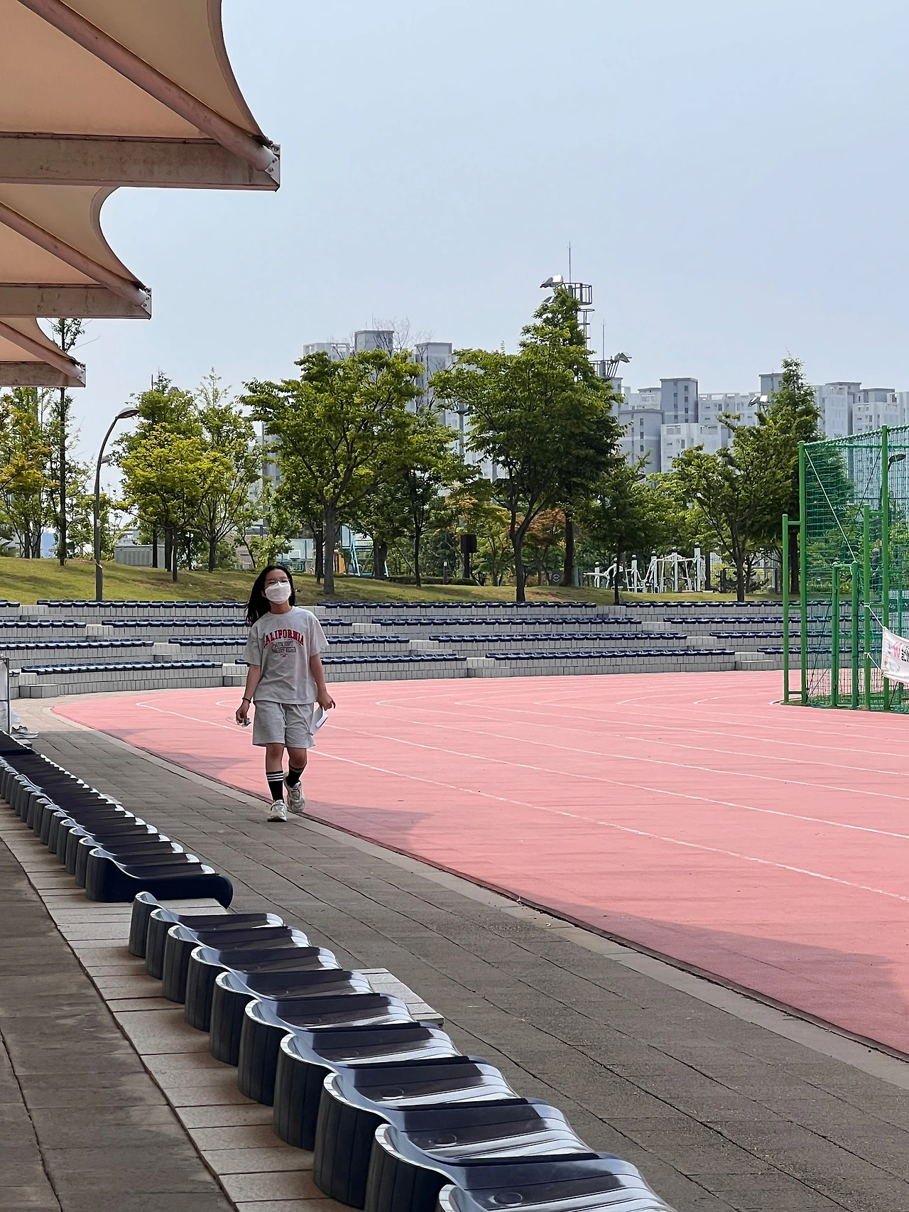 운동장 트랙을 날아다니는 쓰레기를 주워서 둘째는 유유히 쓰레기통에 넣는다.