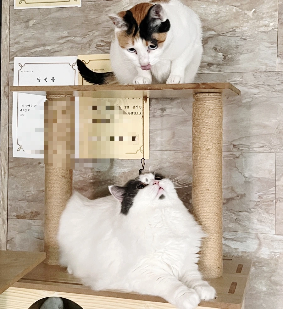 그렇게 우리 가족은 두 냥이와 함께 6 식구가 되었다. 4인가족에서 4인 2 묘 구성체제로 바뀌었다. 아이들은 용돈을 모아서 간식을 사고, 목욕과 발톱 깎는 기술을 필요로 하는 것은 첫째 담당, 둘째는 사랑 담당. 나는 뒤처리 담당, 남편은 냥이들 밥과 모래, 간식 경제적인 담당이다.