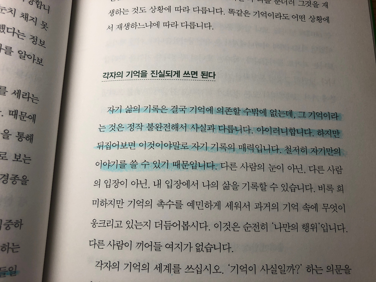 "자기 삶의 기록은 결국 기억에 의존할 수밖에 없는데, 그 기억이라는 것은 정작 불완전해서 사실과 다릅니다. 아이러니 합니다. 하지만 뒤집어보면 이것이야말로 자기 기록의 매력입니다. 철저히 자기만의 이야기를 쓸 수 있기 때문입니다." (손바닥 자서전 특강, p81)