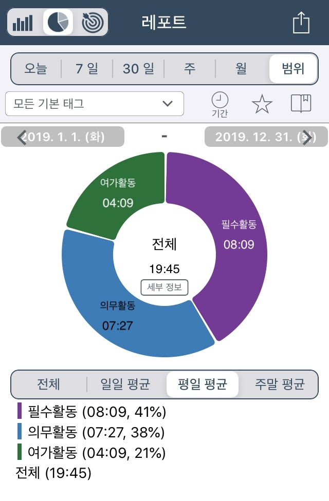 시간을 크게 3종류로 구분해서 기록했다. 필수활동, 의무활동, 여가활동.
