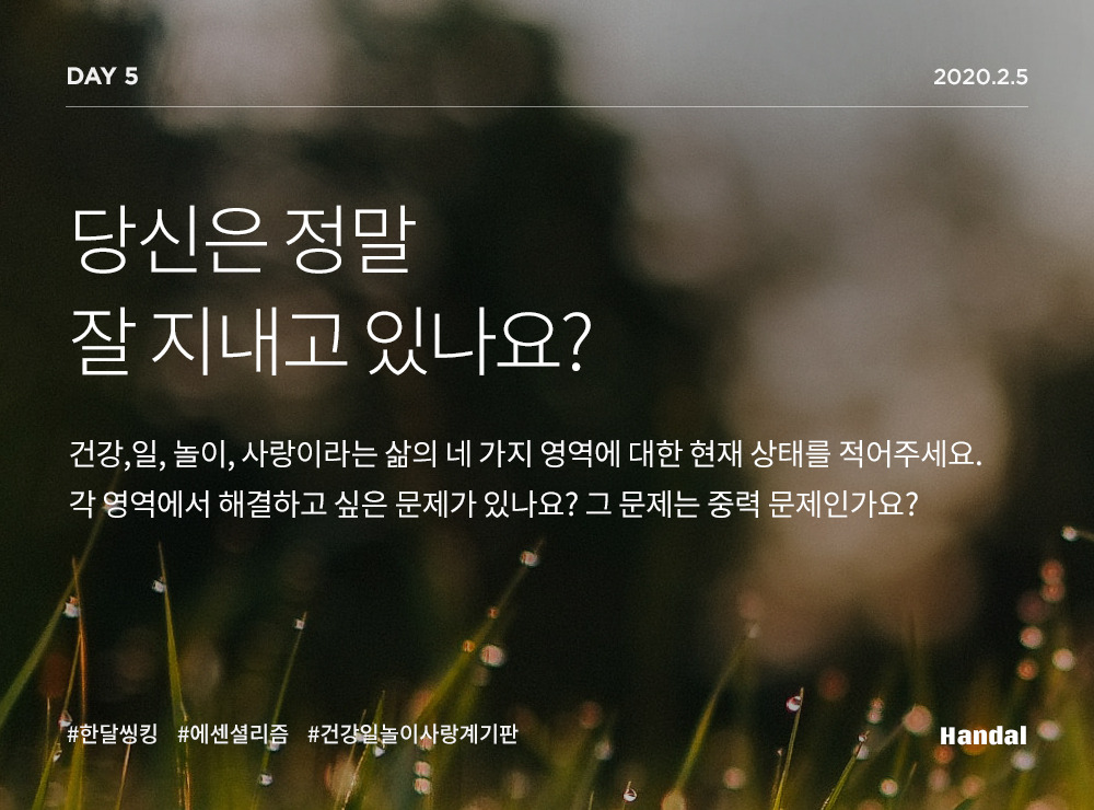 "오늘 작성할 인생계기판은 철저히 정성적인 평가입니다. [ 에센셜리즘 ]에서 말한 것처럼 잠시 시간을 마련해 생각해볼 수 있는 계기를 마련해 주는 도구라고 보시면 될 것 같네요. 첨부해드리는 PPT로 인생 계기판의 게이지를 채워보세요. 내 삶의 현재 상태가 균형 잡힌 삶인지 눈으로 확인할 수 있으니까요. 단순한 형태지만 강렬합니다."