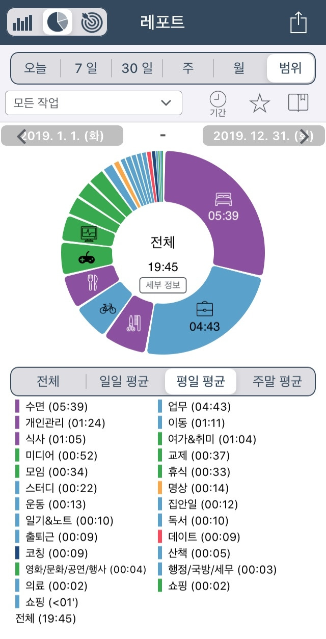 전체적으로 수면시간이 좀 모자라 보인다. 그리고 평일엔 일을 더 많이 하고 주말엔 좀 더 많이 놀았던걸 확인 할 수 있다.