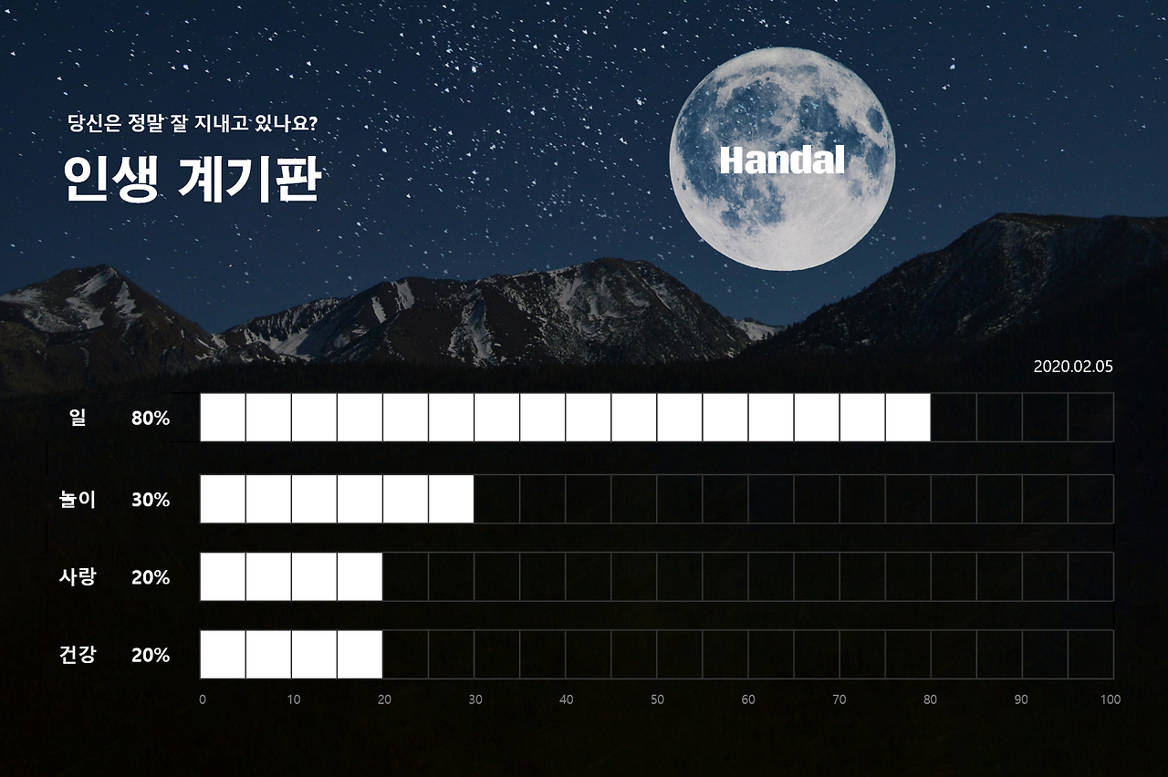 일 80%, 놀이 30%, 사랑 20%, 건강 20%